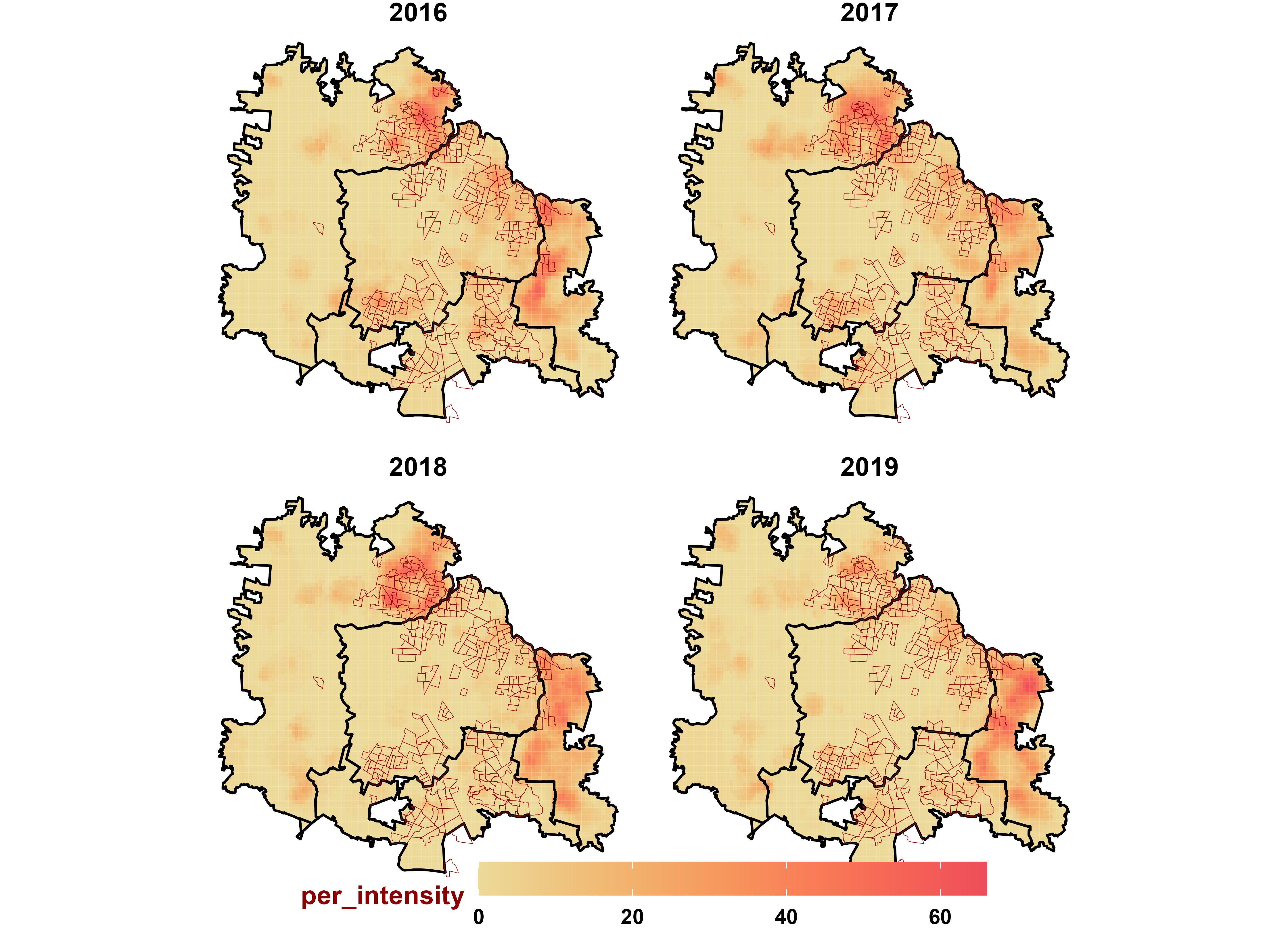 ] ] --- ### **Log Gaussian Cox Process** <hr style="height:2px;border-width:0;color:#330019;background-color:#330019"> .panelset.sideways[ .panel[.panel-name[Código] ```r # Step 1. load the dengue geocoded dataset #### load("C:/Users/HOME/OneDrive/proyects/geocoding_mex/2022/9.RData_geocoded/den2022_positivos.RData") # Step 2. extract the dengue cases ##### geocoded_dataset <- z |> dplyr::filter(ESTATUS_CASO == 2) |> dplyr::mutate(onset = FEC_INI_SIGNOS_SINT, date = as.character(onset), id = VEC_ID) |> dplyr::mutate(x = long, y = lat) |> sf::st_as_sf(coords = c("long", "lat"), crs = 4326) |> dplyr::select(x, y, onset) # Step 3. extract the locality #### loc <- rgeomex::extract_locality(cve_edo = 31, locality = "Mérida") # Step 4. extract the dengue cases of the locality geocoded_dataset <- geocoded_dataset[loc,] |> sf::st_drop_geometry() # Step 5. map of lgcp library(magrittr) library(ggplot2) library(sf) library(sp) library(plotly) library(htmlwidgets) (denhotspots::spatial_lgcp(dataset = geocoded_dataset, locality = "Merida", cve_edo = "31", longitude = "x", latitude = "y", k = 30, plot = FALSE, aproximation = "gaussian", integration = "laplace", resolution = 0.015, approach = "lattice", cell_size = 1500, name = "YlGnBu")$map) ``` ] .panel[.panel-name[Merida]