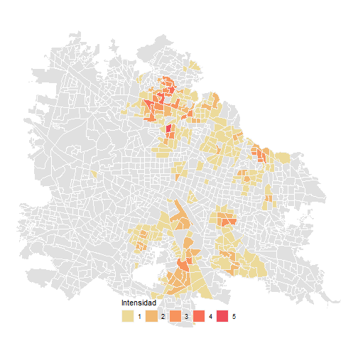 ] .panel[.panel-name[Código] ```r # Step 1. load the dengue geocoded dataset #### load("C:/Users/HOME/OneDrive/proyects/geocoding_mex/2022/9.RData_geocoded/den2022_positivos.RData") # Step 2. extract the dengue cases ##### geocoded_dataset <- z |> dplyr::filter(ESTATUS_CASO == 2) |> dplyr::mutate(onset = FEC_INI_SIGNOS_SINT, date = as.character(onset), id = VEC_ID) |> dplyr::mutate(x = long, y = lat) |> sf::st_as_sf(coords = c("long", "lat"), crs = 4326) |> dplyr::select(x, y, onset) # Step 3. extract the locality #### loc <- rgeomex::extract_locality(cve_edo = 26, locality = "Navojoa") # Step 4. extract the dengue cases of the locality geocoded_dataset <- geocoded_dataset[loc,] |> sf::st_drop_geometry() # Step 5. map of lgcp library(magrittr) library(ggplot2) library(sf) library(sp) library(plotly) library(htmlwidgets) (denhotspots::spatial_lgcp(dataset = geocoded_dataset, locality = "Navojoa", cve_edo = "26", longitude = "x", latitude = "y", k = 30, plot = FALSE, aproximation = "gaussian", integration = "laplace", resolution = 0.012, approach = "lattice", cell_size = 1500, name = "YlGnBu")$map) ``` ] .panel[.panel-name[navojoa]