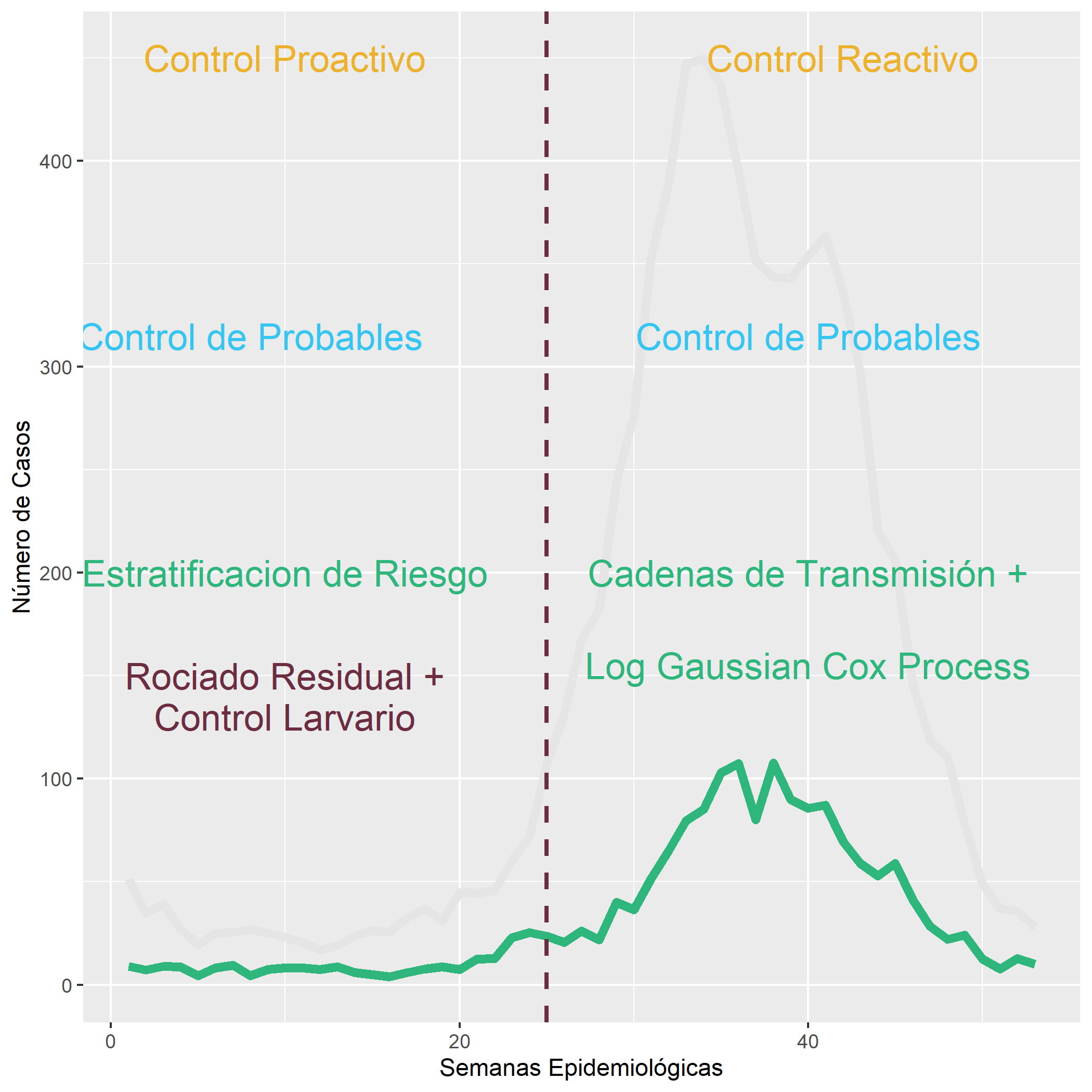 ] ] --- ### **Análisis Geoéstadístico del Vector del Dengue** <hr style="height:2px;border-width:0;color:#330019;background-color:#330019"> .panelset.sideways[ .panel[.panel-name[Código 1] ```r deneggs::eggs_hotspots(path_lect = "C:/Users/HOME/Dropbox/cenaprece_datasets/2022/14_jalisco", cve_ent = "14", locality = c("Guadalajara", "Zapopan", "Tlaquepaque", "Tonala"), path_coord = "C:/Users/HOME/Dropbox/cenaprece_datasets/2022/14_jalisco/DescargaOvitrampasMesFco.txt", longitude = "Pocision_X", latitude = "Pocision_Y", aproximation = "gaussian", integration = "eb", fam = "zeroinflatednbinomial1", k = 40, palette_vir = "magma", leg_title = "Huevos", plot = FALSE, hist_dataset = FALSE, sem = 40, var = "eggs", cell_size = 2000, alpha = .99)$map ``` ] .panel[.panel-name[Semana 40] <img src="index_files/figure-html/unnamed-chunk-27-1.png" width="100%" /> ] .panel[.panel-name[Codigo 2] ```r deneggs::eggs_hotspots(path_lect = "C:/Users/HOME/Dropbox/cenaprece_datasets/2022/14_jalisco", cve_ent = "14", locality = c("Guadalajara", "Zapopan", "Tlaquepaque", "Tonala"), path_coord = "C:/Users/HOME/Dropbox/cenaprece_datasets/2022/14_jalisco/DescargaOvitrampasMesFco.txt", longitude = "Pocision_X", latitude = "Pocision_Y", aproximation = "gaussian", integration = "eb", fam = "zeroinflatednbinomial1", k = 30, palette_vir = "magma", leg_title = "Huevos", plot = FALSE, hist_dataset = FALSE, sem = 41, var = "eggs", cell_size = 2000, alpha = .99)$map ``` ] .panel[.panel-name[Semana 41] <img src="index_files/figure-html/unnamed-chunk-28-1.png" width="100%" /> ] .panel[.panel-name[Codigo 3] ```r deneggs::eggs_hotspots(path_lect = "C:/Users/HOME/Dropbox/cenaprece_datasets/2022/14_jalisco", cve_ent = "14", locality = c("Guadalajara", "Zapopan", "Tlaquepaque", "Tonala"), path_coord = "C:/Users/HOME/Dropbox/cenaprece_datasets/2022/14_jalisco/DescargaOvitrampasMesFco.txt", longitude = "Pocision_X", latitude = "Pocision_Y", aproximation = "gaussian", integration = "eb", fam = "zeroinflatednbinomial1", k = 30, palette_vir = "magma", leg_title = "Huevos", plot = FALSE, hist_dataset = FALSE, sem = 42, var = "eggs", cell_size = 2000, alpha = .99)$map ``` ] .panel[.panel-name[Semana 42] <img src="index_files/figure-html/unnamed-chunk-29-1.png" width="100%" /> ] .panel[.panel-name[Codigo 4] ```r deneggs::eggs_hotspots(path_lect = "C:/Users/HOME/Dropbox/cenaprece_datasets/2022/14_jalisco", cve_ent = "14", locality = c("Guadalajara", "Zapopan", "Tlaquepaque", "Tonala"), path_coord = "C:/Users/HOME/Dropbox/cenaprece_datasets/2022/14_jalisco/DescargaOvitrampasMesFco.txt", longitude = "Pocision_X", latitude = "Pocision_Y", aproximation = "gaussian", integration = "eb", fam = "zeroinflatednbinomial1", k = 30, palette_vir = "magma", leg_title = "Huevos", plot = FALSE, hist_dataset = FALSE, sem = 43, var = "eggs", cell_size = 2000, alpha = .99)$map ``` ] .panel[.panel-name[Semana 43] <img src="index_files/figure-html/unnamed-chunk-30-1.png" width="100%" /> ] ] --- ### **Análisis Geoéstadístico y Hotspots del Vector del Dengue** <hr style="height:2px;border-width:0;color:#330019;background-color:#330019"> .panelset.sideways[ .panel[.panel-name[Código] ```r #step 1. define the path for the historic dataset #### path_vect <- "C:/Users/HOME/Dropbox/cenaprece_datasets/2022/31_yucatan" path_coord <- paste(path_vect, "DescargaOvitrampasMesFco.txt", sep = "/") # Step 2. run the spde model #### x22 <- deneggs::eggs_hotspots_week(cve_mpo = "102", cve_edo = "31", year = "2022", hist_dataset = FALSE, locality = "Valladolid", path_vect = path_vect, path_coord = path_coord, integration_strategy = "eb", aproximation_method = "gaussian", fam_distribution = "zeroinflatednbinomial1", plot = FALSE, kvalue = 40, palette.viridis = "viridis", cell.size = 500, alpha.value = .99) # Step 3. Visualize the hotspots intensity #### deneggs::eggs_hotspots_intensity_map(spde_betas = x22$betas, years = 2022, locality = "Valladolid", cve_ent = "31", palette = rcartocolor::carto_pal, name = "SunsetDark") ``` ] .panel[.panel-name[Mapa de Intensidad] <img src="index_files/figure-html/unnamed-chunk-32-1.png" width="100%" /> ] ] --- ### **Análisis Geoéstadístico y Hotspots del Vector del Dengue** <hr style="height:2px;border-width:0;color:#330019;background-color:#330019">  --- class: center, middle ### **Modelo de Estratificación del Riesgo de Transmisión de Dengue** <hr style="height:2px;border-width:0;color:#330019;background-color:#330019"> .pull-left[ .blue[Concepto] <img src = "figs/stacked_maps_cases.jpg"> ] .pull-right[ .blue[Mapa de Riesgo] <img src = "figs/map_risk_guadalajara.jpg"> ] .tiny[.blue[.footnote[Dzul-Manzanilla et al 2021.]]] --- ## Definición del Modelo estratégico de focalización .pull-left[ - .red[**Áreas con riesgo muy alto de transmisión**.] Hotposts de casos + hotspots del vector. - .orange[**Áreas con riesgo alto de transmisión**.] Hotspots de transmisión de casos. - .yellow[**Áreas con riesgo medio de transmisión**.] Hotspots del vector. - .green[**Áreas con riesgo bajo de transmisión**]. Sin hotspots del vector o hotspots de casos. ] .pull-right[ Guadalajara <img src="figs/map_risk_guadalajara.jpg" width="90%" /> ] --- ### Control Espacio-Temporal del Dengue <hr style="height:2px;border-width:0;color:#330019;background-color:#330019"> .pull-left[.panel-name[Paradigma Tradicional] <!-- --> ] .pull-right[.panel-name[Nuevo Paradigma] <!-- --> ] .tiny[.blue[.footnote[[Dzul-Manzanilla et al 2021](https://www.thelancet.com/journals/lanplh/article/PIIS2542-5196(21)00030-9/fulltext)]]] --- ### **Desarrollo en R** <hr style="height:2px;border-width:0;color:#330019;background-color:#330019"> Dashboards - [Programa de Prevención y Control de las Arbovirosis del Estado de Yucatan](https://fdzul.github.io/denv_dash_yuc/#cadenas-de-transmisi%C3%B3n) - [Estratificacion del Riesgo de Transmisión de Dengue del Estado de Veracruz](https://fdzul.github.io/dengue_risk_map_veracruz/#dengue-risk-maps) Manuales - [Manual para la identi